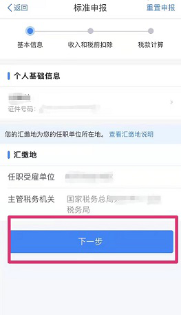 (4)对界面显示的个人基础信息、汇缴地、已缴税额进行查看、确认。如信息无误,可直接点击【下一步】,数据系统将自动计算您本年度工资薪金等收入以及综合所得应补(退)税额。