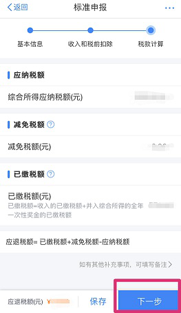 根据您已选择的计税方式,点击【下一步】,系统自动计算您应退或者应补交的税额,按提示进行下一步操作,绑定银行卡申请退税或者选择缴纳方式补税。如您符合条件,右下角会有“享受免申报”,点击即可完成本年度个人所得税汇算。